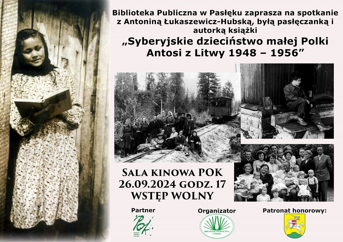 Biblioteka Publiczna w Pasłęku zaprasza na spotkanie z Antoniną Łukaszewicz-Hubską, autorką książki „Syberyjskie dzieciństwo małej Polki Antosi z Litwy 1948 – 1956” w czwartek 26 września o godzinie 17 do...