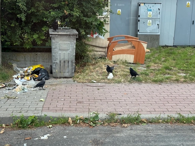 I znowu te wredne ptaki robią bałagan przy śmietnikach. Ale to my ułatwiamy im zadanie zostawiajac worki z odpadami obok pojemników. Na zdjęciu dzisiejszy widok z ulicy Zwycięstwa. Niczego tam nie brakuje,...
