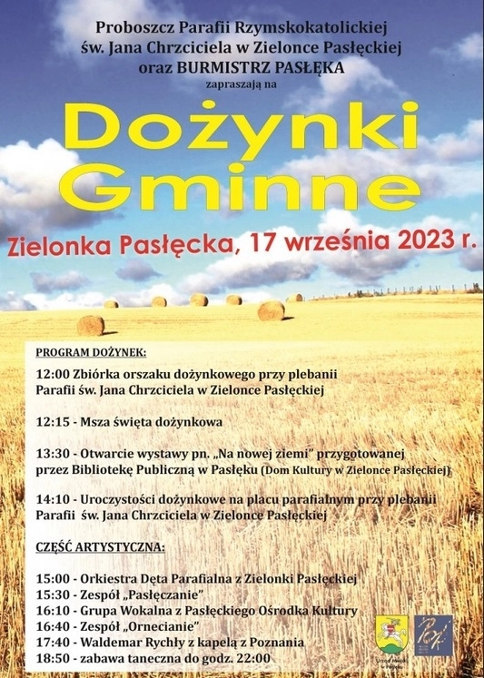 Proboszcz Parafii Rzymskokatolickiej św. Jana Chrzciciela w Zielonce Pasłęckiej oraz Burmistrz Pasłęka zapraszają na Dożynki Gminne, które odbędą się w niedzielę, 17 września 2023 roku. O godzinie 12:15 w...