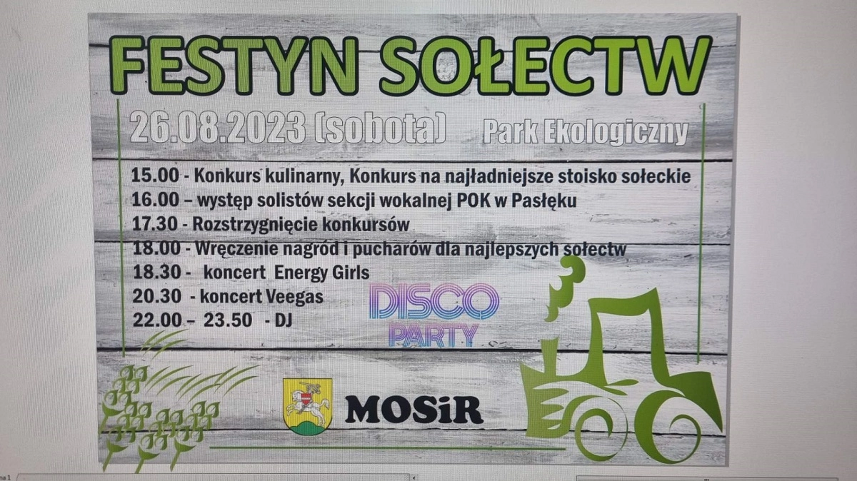 Miłośników dobrego jedzenia i muzyki disco polo zapraszamy w sobotę do Parku Ekologicznego na Festyn Sołectw i Festiwal Disco Polo. Impreza kończąca wakacje i sezon urlopowy rozpoczyna się o godzinie 15:00....