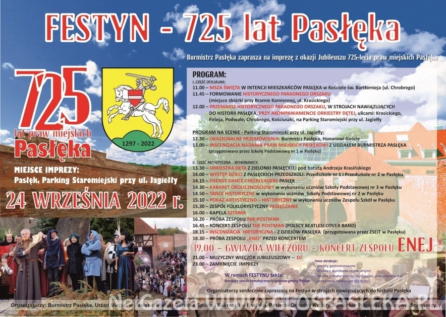 Wspaniały koncert zespołu Enej był zwieńczeniem obchodów 725 – lecia Pasłęka. Jednak nie tylko Enej decydował o tym, że na parking staromiejski przybyły tłumy pasłęczan i gości. Doskonale przygotowana parada...