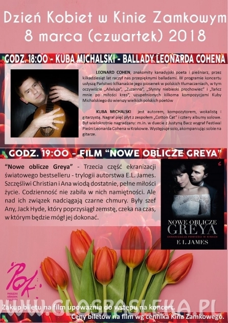 Z okazji Dnia Kobiet Pasłęcki Ośrodek Kultury zaprasza 8 marca (czwartek) 2018 r . o godz. 18:00 do sali widowiskowo – kinowej na koncert Kuby Michalskiego, który wykona ballady Leonarda Cohena oraz na film...