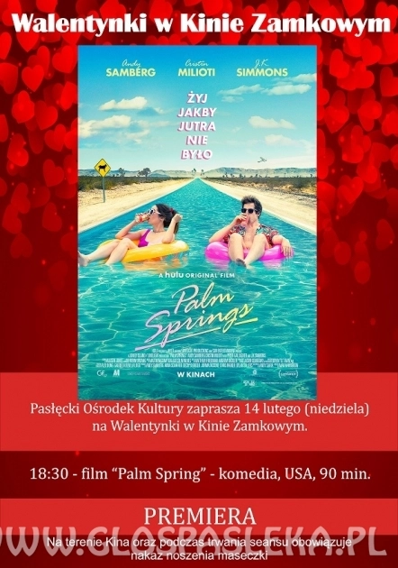 Pasłęcki Ośrodek Kultury zaprasza 14 lutego (niedziela) na Walentynki w Kinie Zamkowym. -18:30 film "Palm Springs" - komedia, USA. Serdecznie zapraszamy! PREMIERA PALM SPRINGS Żyj, jakby jutra nie było!...