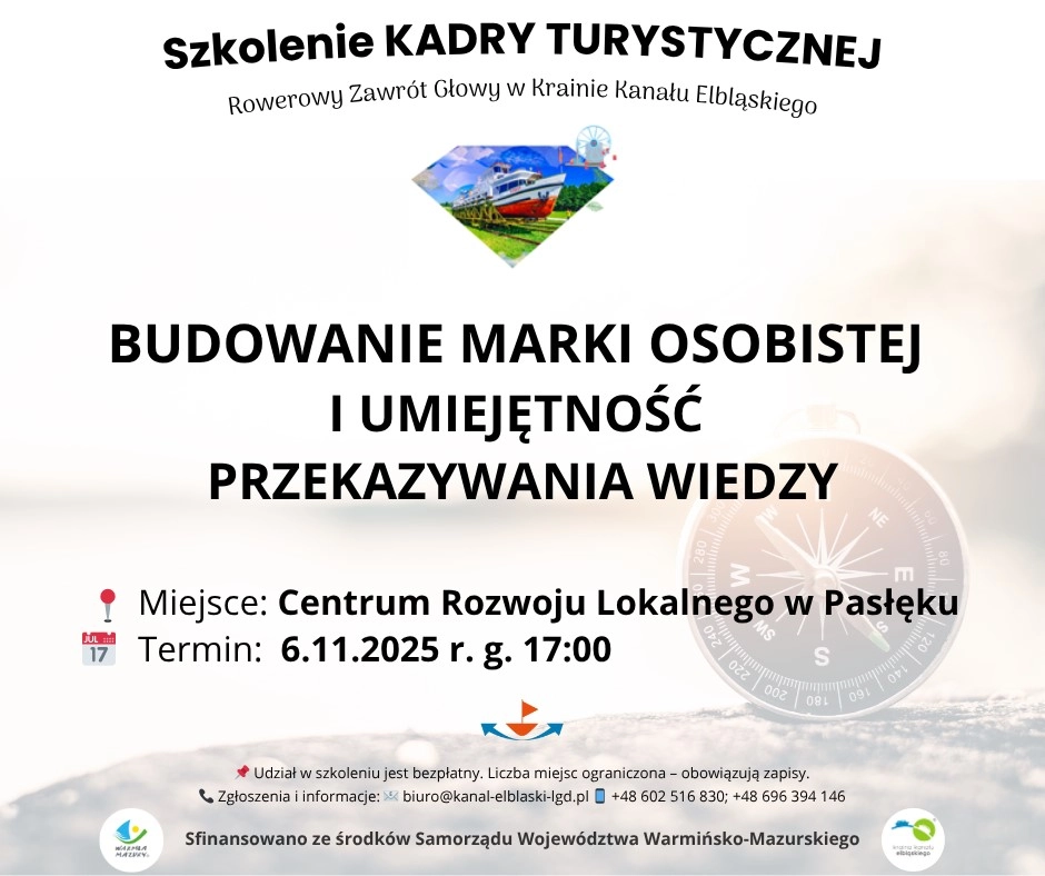 Szanowni Państwo Stowarzyszenie Łączy Nas Kanał Elbląski Lokalna Grupa Działania serdecznie zaprasza na szkolenie dla kadry turystycznej pt. Budowanie marki osobistej i umiejętność przekazywania wiedzy...