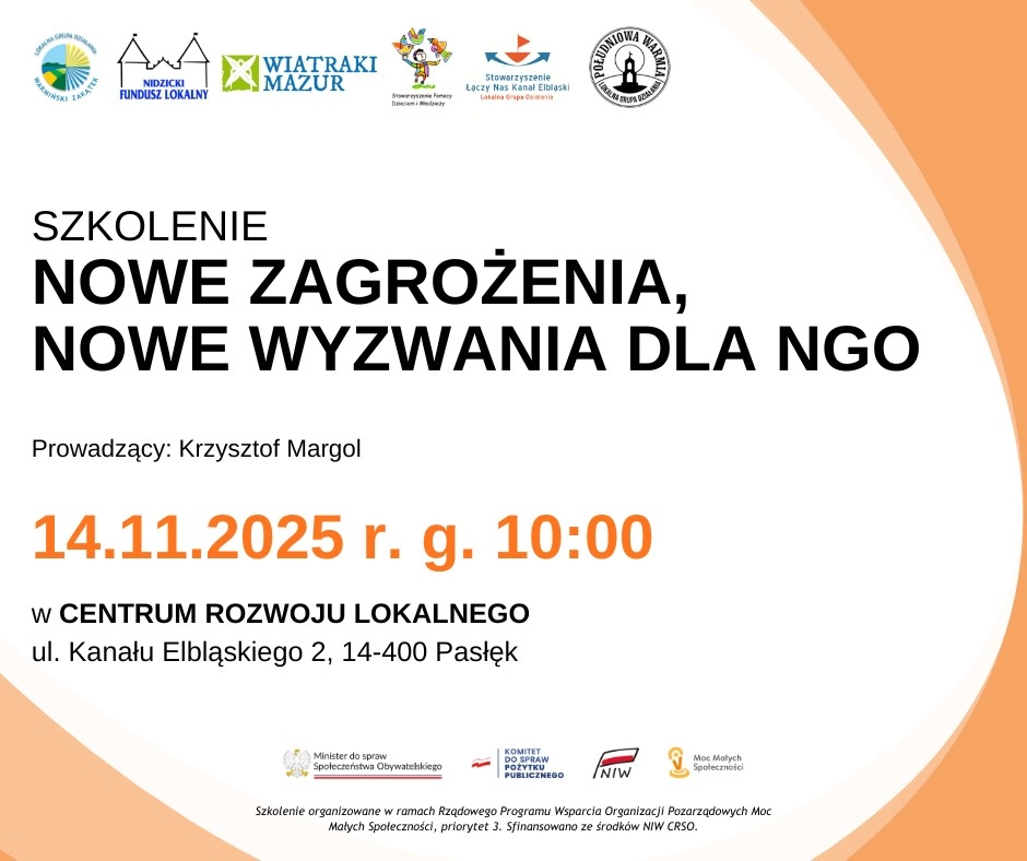 Szanowni Państwo serdecznie zapraszamy na szkolenie pt. „Nowe zagrożenia, nowe wyzwania dla NGO”, które odbędzie się 14 listopada 2025 r. (piątek) o godz. 10:00 w Centrum Rozwoju Lokalnego w Pasłęku, ul....