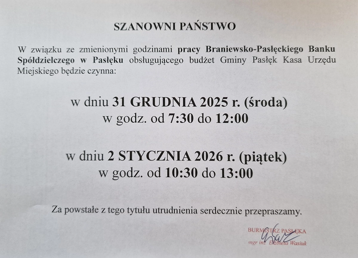 Niniejszym informuję, że XXVI sesja Rady Miejskiej w Pasłęku kadencji 2024–2029, uprzednio zwołana na dzień 18 grudnia 2025 roku, odbędzie się w dniu 30 grudnia 2025 roku (wtorek) o godz. 13:00 w Sali im....