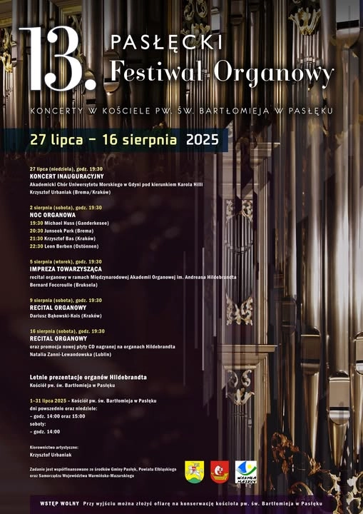 W niedzielę 27 lipca 2025 roku rozpoczyna się 13. Pasłęcki Festiwal Organowy. Jako prolog do tego wydarzenia odbędą się letnie prezentacje organów Hildebrandta w Pasłęku. Prezentacje będą odbywały się...