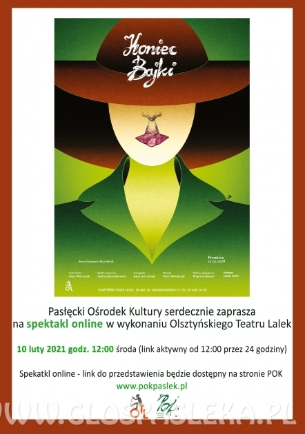 Pasłęcki Ośrodek Kultury serdecznie zaprasza na spektakl w wykonaniu Olsztyńskiego Teatru Lalek pt. Koniec Bajki. Zapowiedź spektaklu do obejrzenia w linku:...