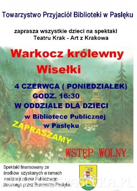 Przedstawienie zaplanowano na 4. czerwca o godz.16:30 w Oddziale dla Dzieci w Bibliotece Publicznej w Pasłęku Spektakl finansowany ze środków uzyskanych w ramach realizacji zdania Publicznego zleconego przez...