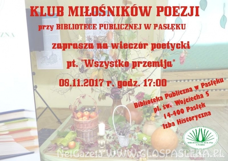 Tym razem recytowane wiersze będą nawiązywały do hasła "Wszystko przemija". Zainteresowane osoby zapraszamy w środę 8. listopada do pasłęckiej biblioteki o godzinie 17-stej.