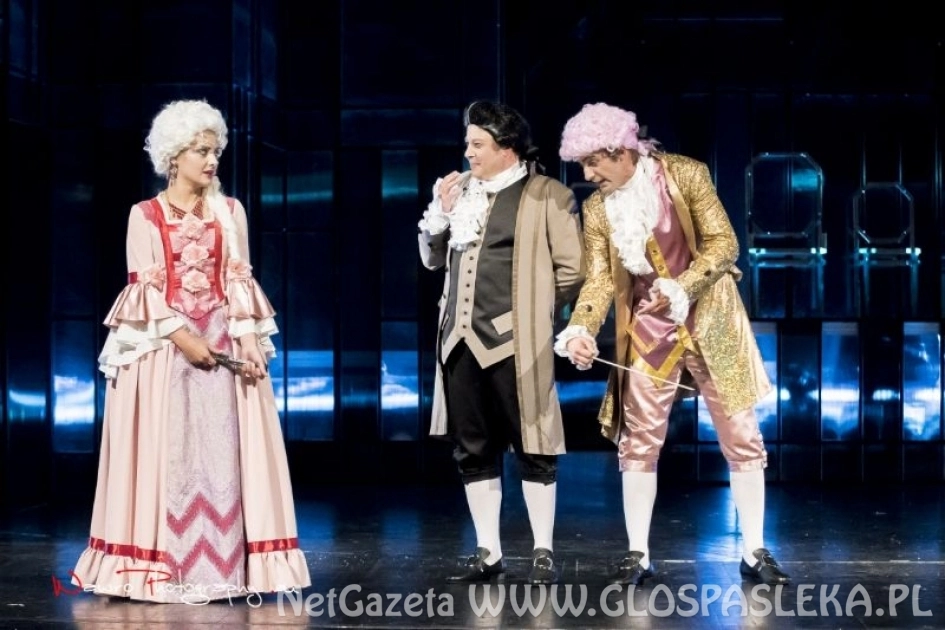 Na scenie przedstawiono epizody z życia Wolfganga Amadeusza Mozarta (od zabawnych przez patetyczne, a nawet przejmująco smutne). Odtwórcy ról Amadeusza (przebojowy Piotr Boratyński) i Konstancji (świetna...