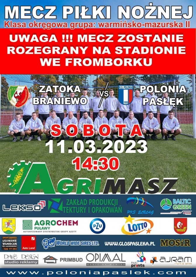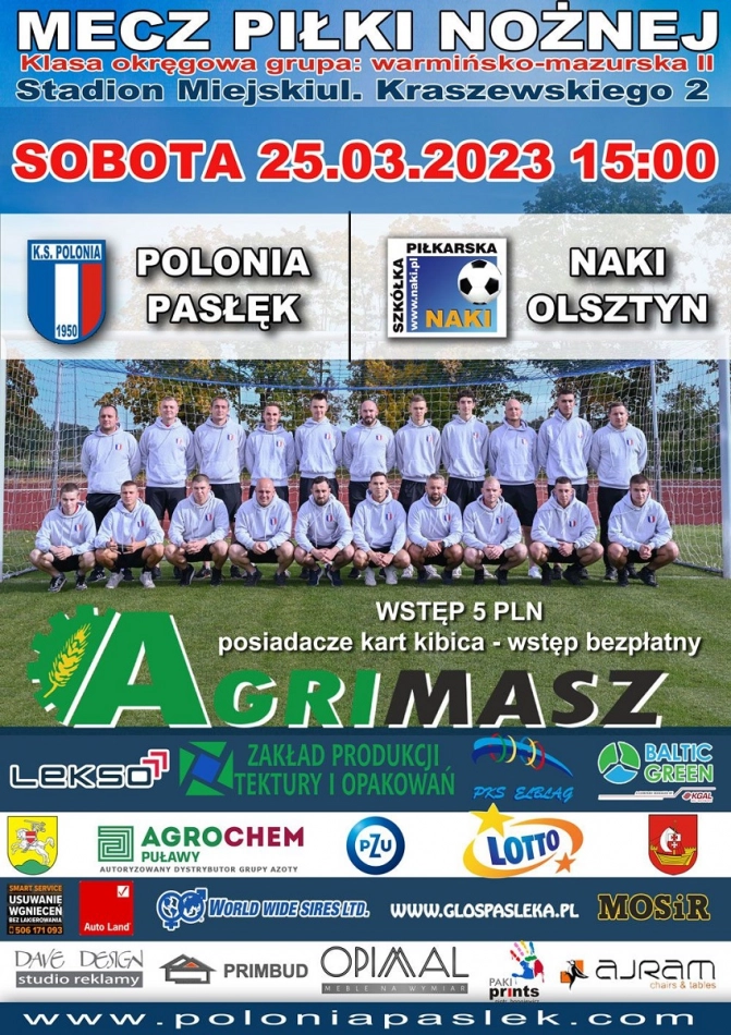 W sobotę, 25 marca o godz.15.00 na Stadionie Miejskim w Pasłęku Polonia rozegra osiemnastą kolejkę rozgrywek o mistrzostwa klasy okręgowej gr. 2. Przeciwnikiem pasłęckich piłkarzy będzie drużyna Naki...