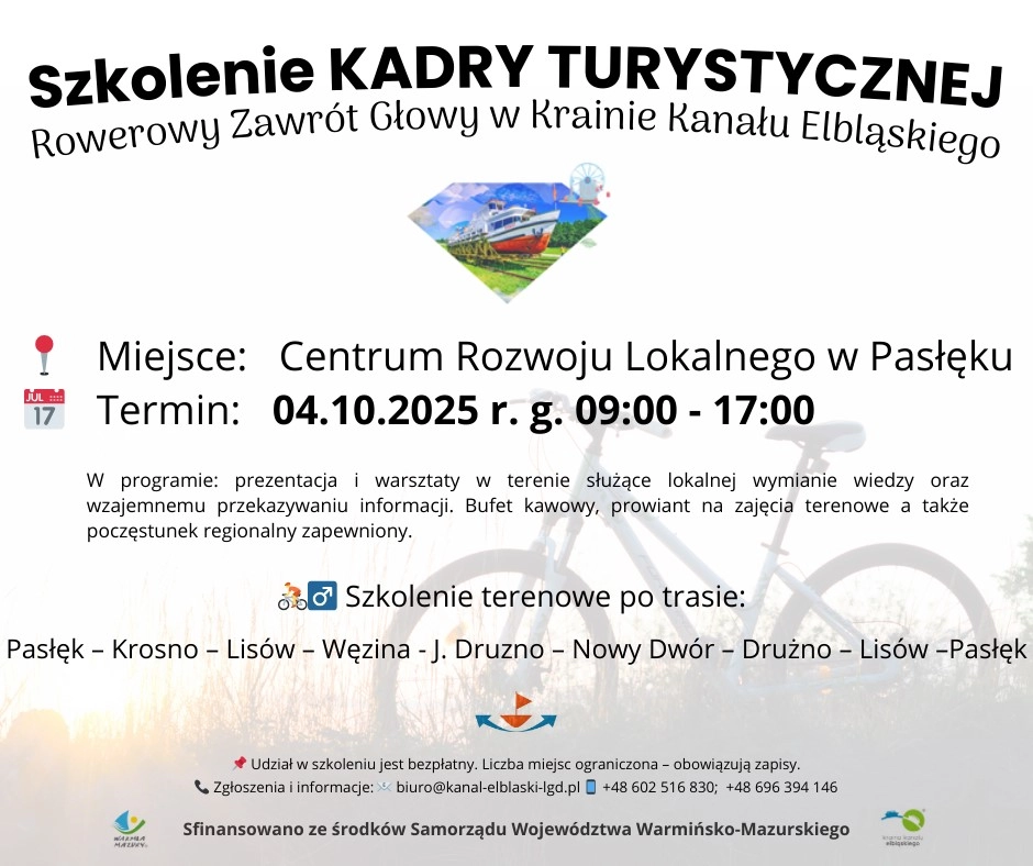 Centrum Rozwoju Lokalnego zaprasza na kolejne szkolenie terenowe na trasie Pasłęk – Krosno – Lisów – Węzina – J. Drużno – Nowy Dwór – Drużno – Lisów – Pasłęk. Rajd rowerowy będzie miał miejsce w sobotę 4...